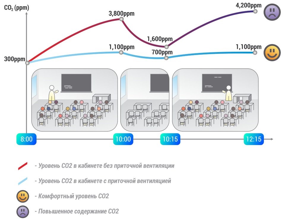 Следует понимать, что большинство школ, как правило, находятся в городе. Рядом всегда располагаются дороги, автомагистрали и загазованные парковки. Именно поэтому, окна в школах предпочитают закрывать. Если на улице зима или осень, то окна также оставляют закрытыми чтобы избежать сквозняков. Воздух в кабинете ведет себя приблизительно так (рост углекислого газа):