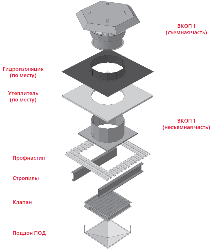 ВКОП®1 – новая разработка с улучшенным внешним видом состоит, помимо самого вентилятора, из собственной монтажной плиты с размерами соответствующими новым СТАМ®-2012 (монтажные основания в кровлю). Также, в состав ВКОП®1 входит специальная внешняя облицовка для прямого монтажа гидроизоляции при монтаже непосредственно в кровлю без дополнительного основания СТАМ®-2012.Для защиты от случайных протечек при сильных осадках или конденсации влаги из помещения на холодных элементах ВКОП 1 необходимо применять дополнительные решения: поддоны серии ПОД.