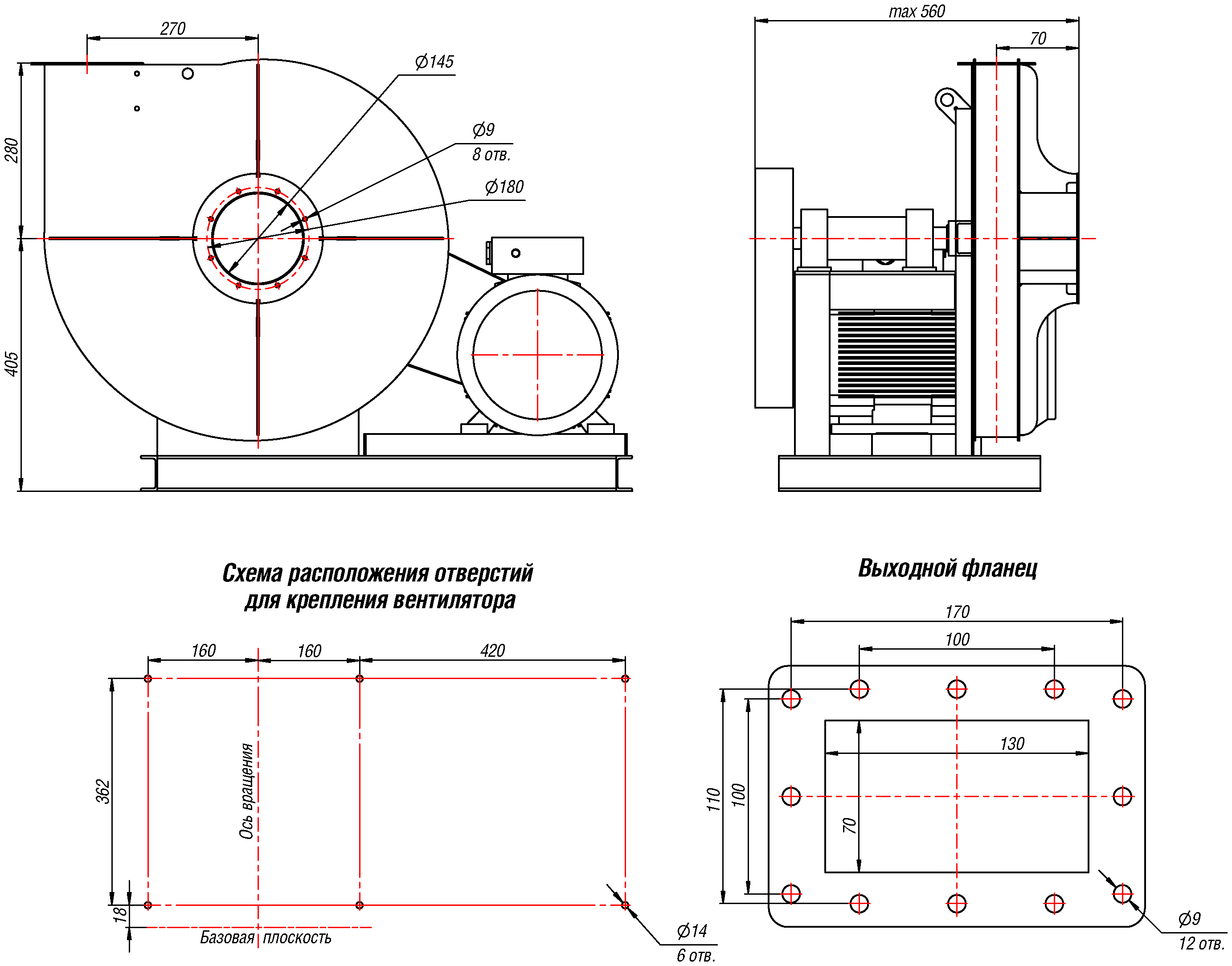 Габаритные и присоединительные размеры радиального вентилятора ВР 140-15 №5, Исполнение 1
